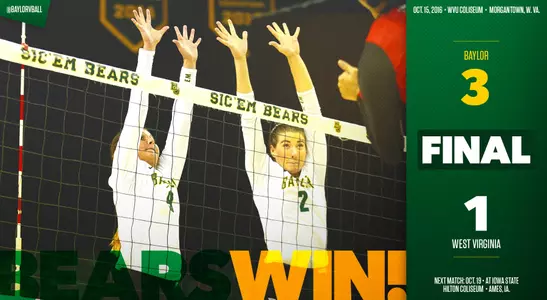 MORGANTOWN, W. Va. - Baylor volleyball (16-6, 4-2 Big 12) powered through the West Virginia Mountaineers (11-10, 2-5 Big 12), 25-22, 25-16, 22-25, 25-21, on Saturday afternoon in the WVU Coliseum.