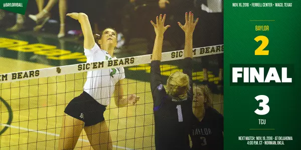 FORT WORTH, Texas - Baylor volleyball (20-9, 8-5 Big 12) fell in a tight, five-setter to the TCU Horned Frogs (12-12, 5-9 Big 12), 21-25, 25-23, 23-25, 25-18, 13-15, Wednesday evening in the University Recreation Center.