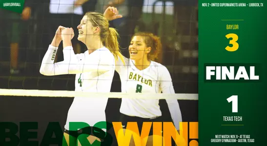 LUBBOCK, Texas - Baylor volleyball (19-7, 7-3 Big 12) rolled through the Texas Tech Red Raiders (10-16, 0-11 Big 12), 25-19, 25-20, 21-25, 25-22, Wednesday evening at the United Supermarkets Arena.