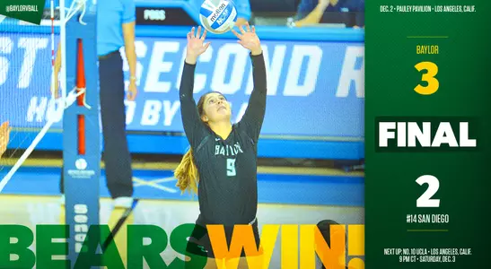 LOS ANGELES - Baylor volleyball (22-11) clawed a five-set win over No. 14 San Diego (24-6), 16-25, 25-18, 17-25, 25-20, 15-13, on Friday evening in Pauley Pavilion on the UCLA campus, opening the team's run in the NCAA Volleyball tournament.