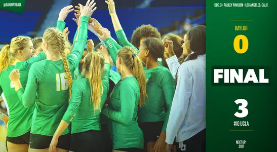 LOS ANGELES - Baylor volleyball (22-12) saw its season come to a close with a three-set loss to the hosts, No. 10 UCLA Bruins (26-6), 21-25, 20-25, 20-25, on Saturday evening in Pauley Pavilion on the UCLA campus.