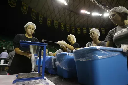 Three, two-hour packing sessions, each beginning with a 15-minute overview of FMSC's work around the world, will take place on the arena's main floor starting at 2 p.m., and feature student-athletes and coaches from each of Baylor's 19 intercollegiate athletic programs. Volunteers will put on hairnets and gather in an energetic atmosphere to hand-pack rice meals filled with essential nutrients specifically formulated to nourish hungry children around the world.