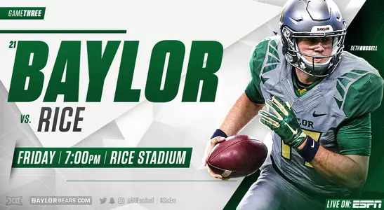 - In its first road game of 2016, Baylor faces Rice Friday at 7 p.m. in Houston on ESPN.
