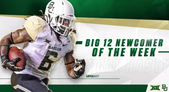 IRVING, Texas ÃÆ' ¢Ãƒ ¢' ¬" Baylor football running back JaMycal Hasty was named the Big 12 Newcomer of the Week, conference officials announced Monday.