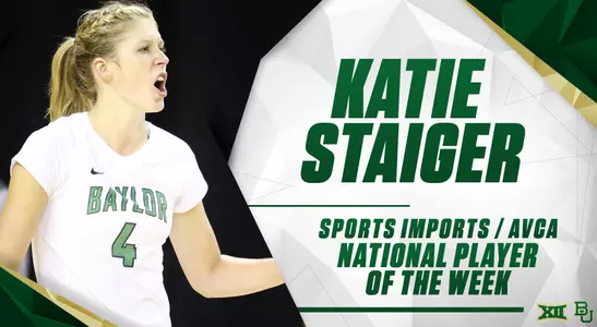 WACO, Texas - Baylor volleyball's redshirt junior outside hitter Katie Staiger was picked as the Sports Imports/American Volleyball Coaches Association Player of the Week, announced Tuesday afternoon by the AVCA.