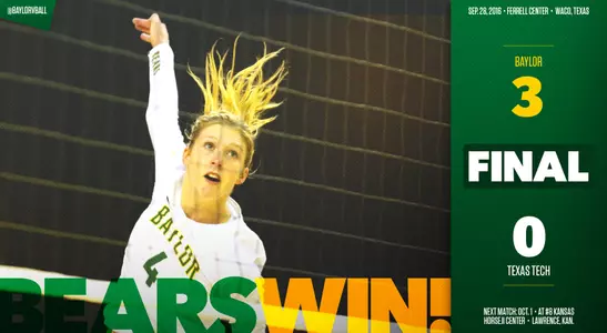 It wasn't always pretty, but the Bears (14-4, 2-0) did just that, sweeping Texas Tech, 25-17, 26-24, 25-19, for its 10th win in a row and first 2-0 start in league play since 2008.