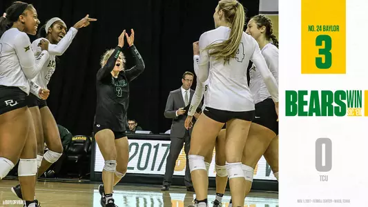 WACO, Texas -- No. 24 Baylor volleyball (19-5, 9-2 Big 12) earned its third consecutive sweep over a Big 12 opponent Wednesday night, defeating TCU (10-12, 2-8 Big 12) in straight sets at the Ferrell Center, 25-20, 25-14, 25-18.