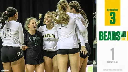 WACO, Texas -- No. 19 Baylor volleyball (22-5, 12-2 Big 12) pushed its season-best consecutive sets winning streak to 16 before the Bears were forced to fight back from a second-set loss in a 3-1 win over Kansas State (9-18, 2-12 Big 12) Wednesday night at the Ferrell Center, 25-14, 20-25, 25-16, 25-19.