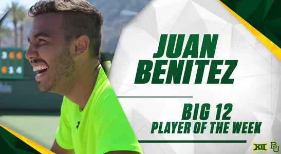 IRVING, Texas - Baylor men's tennis sophomore Juan Benitez was named the Big 12 Player of the Week Tuesday, after going 3-0 in singles play against top-50 ranked players, and winning two out of his three doubles matches alongside Will Little, at the BNP Paribas Collegiate Challenge Presented by Oracle this past weekend in Indian Wells, Calif.
