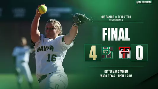 WACO, Texas - No. 13/14 Baylor softball (32-6, 5-1 Big 12) finished off a three-game sweep over the Texas Tech Red Raiders (16-17, 3-3 Big 12), taking the 4-0 win on Saturday afternoon at Getterman Stadium.