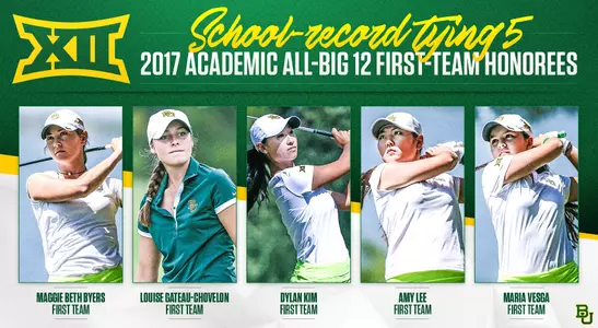 Maggie Beth Byers, Louise Gateau-Chovelon, Dylan Kim, Amy Lee and Maria Vesga all earned first-team recognition. BU matched last season's school record of five first-team honorees. The league selected a total of 36 women's golfers to Academic All-Big 12 Teams, including 34 first-team honorees.