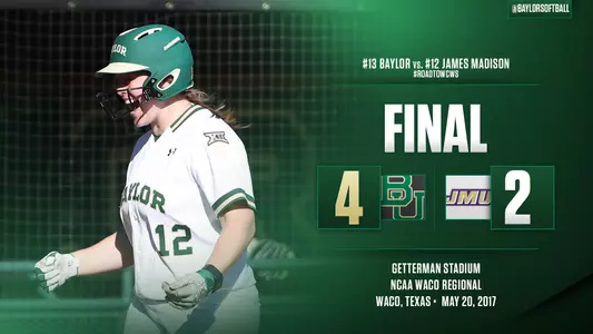 WACO, Texas -- No. 15-seeded Baylor softball (45-12) punched its ticket into the NCAA Waco Regional final, knocking off the 12th-ranked James Madison Dukes (51-7) on Saturday afternoon at Getterman Stadium.