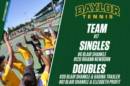 Senior Blair Shankle led the way with a No. 6 national ranking after a stellar season for the Lady Bears. She played her way to a 30-5 mark overall and an 18-2 record in dual match action in the No. 1 singles position. Against ranked opponents, Shankle went 12-5.
