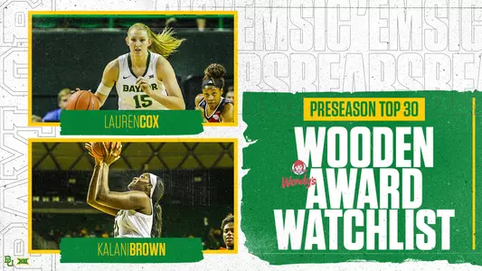 Cox joins the Wooden Award watch list after earning two All-American honors last season, and she was also named to the WBCA's Katrina McClain Award Watch List after being a top-five finisher last season for the honor. Cox averaged 15.3 points and 9.7 rebounds for the Lady Bears last season.