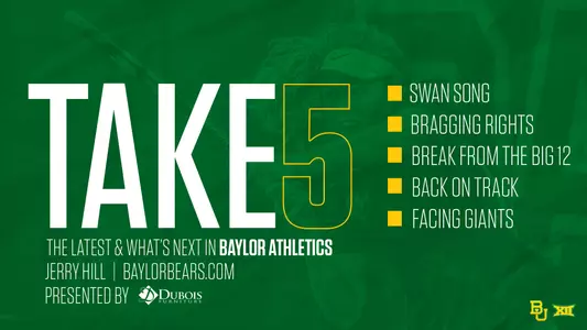 1. Swan song. Theresa Van Zyl, the lone senior for the 25th-ranked women's tennis team, will play her final matches at the Hurd Tennis Center this weekend. The Lady Bears will play Louisiana Tech (10:30 a.m.) and West Virginia (5 p.m.) on Friday, then Iowa State (1 p.m.) and UT-Arlington (6 p.m.) on Sunday.